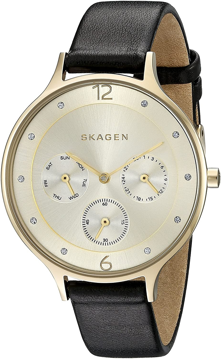 Skagen Women's Anita Black Leather Gold Tone Dial Watch SKW2393