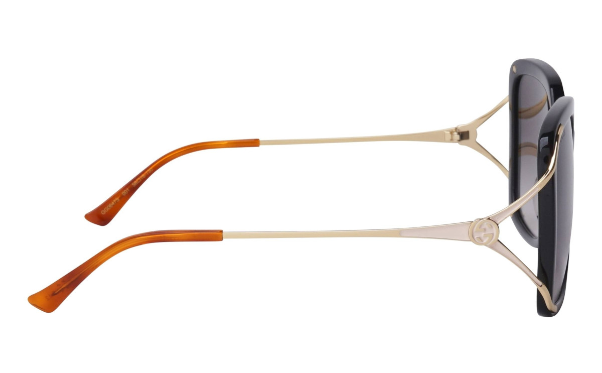 These Gucci women's sunglasses in butterfly style feature a full-rim black/gold frame with a grey gradient lens.